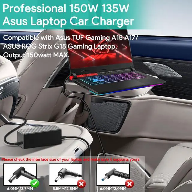 [(Asus Gaming Laptop Car Charger Specifications)] Input Voltage 12V-24V (9V-32V Max) DC Adapter for 12V Cars,24V Trucks,Travel Trailer,RV, Buses, School Buses,SUV, ATV, Van,Boat, Yachts, Airplanes, Portable Power Station,Bike,Campers and Motorcycles etc; Output: 20V 7.5A 150W (Compatible with 19.5V 7.7A 150W / 19V 6.32A 120W Asus Charger) .Replacement asus power adapter Model: ADP-150CH B / A18-150P1A, Plug size is 6.0*3.7mm. Our asus gaming laptop charger for car will provide the fastest and most efficient output current.