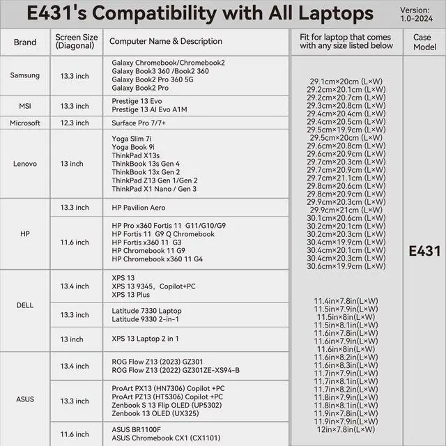 Model No.: E431; internal dimensions of the case:32x21.6x2 cm (12.6x8.5x0.79 inch)