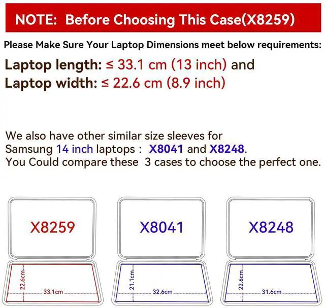 Model No.: X8259; internal dimensions of the case: 33.7x22.6x2.7 cm (13.3x8.9x1.1 inch)