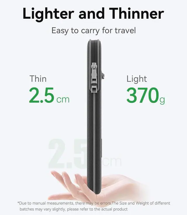 Model No.: S425; Series Name: SlimPro; External dimensions of the case: 37.9x26.8x2.8 cm (14.9x10.6x1.1 inch), internal dimensions of the case: 33.9x23.3x2 cm (13.35x9.17x0.79 inch). Weight: 378g