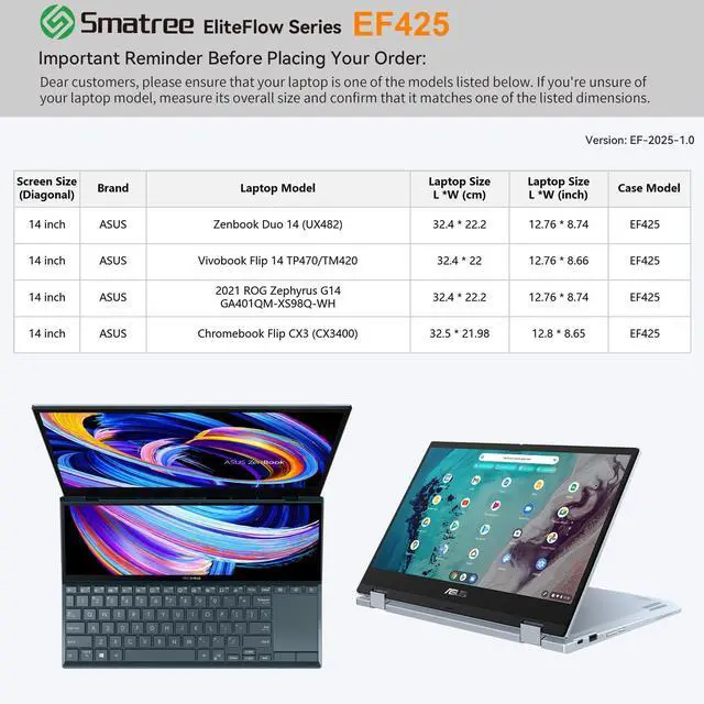 Perfect Fit for 14 inch ASUS Zenbook Duo 14 (UX482); 14 inch ASUS Vivobook Flip 14 TP470/TM420; 14 inch ASUS ROG Zephyrus G14 GA401QM-XS98Q-WH; 14 inch ASUS Chromebook Flip CX3 (CX3400). Tailored dimensions provide a snug fit that minimizes movement, ensuring your laptop stays secure during travel or daily use