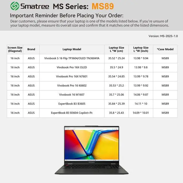 Compatibility: designed to perfectly fit for 16 inch ASUS Vivobook Pro 16X (N7601); 16 inch ASUS Vivobook S 16 FLIP OLED TN3604YA/(TP3604); 16 inch ASUS Vivobook Pro 16X OLED; 16 inch ASUS Vivobook Pro 16 (K6602); 16 inch ASUS ExpertBook B3 (B3604) Copilot+Pc