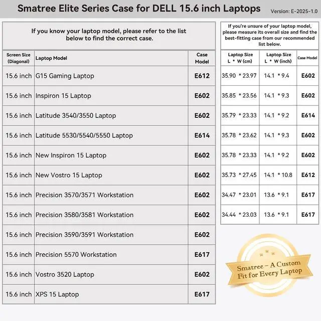 Custom Sizes: Smatree offers nearly 100 tailored sleeve options for DELL laptops and many more for brands like Lenovo, ASUS, HP, MSI, Samsung, Microsoft, Apple, Acer, Razer and others. Our sleeves are precisely crafted to match the dimensions of your laptop, providing a perfect fit that generic cases can't achieve ^^ Durable,