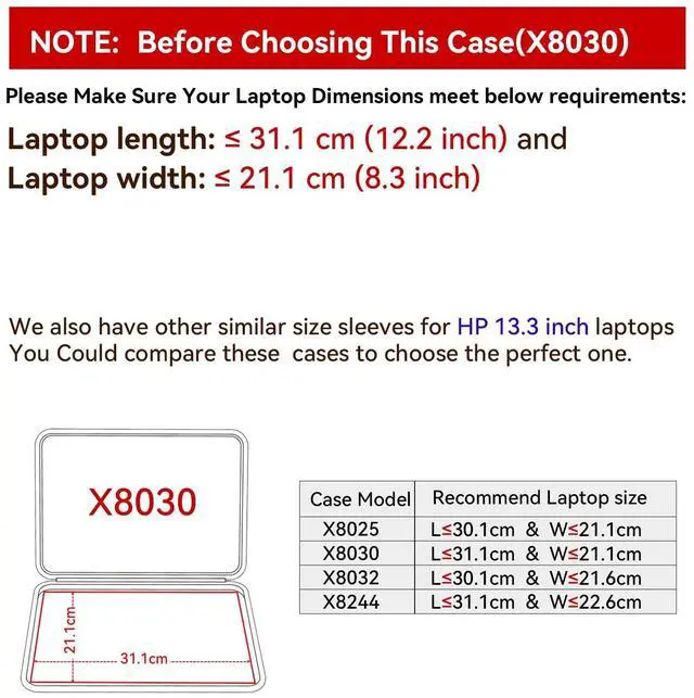 Recommend Laptop Size: 31.1 x 21.1 x 2.2 cm. Please confirm your laptop dimension. If the size of your laptop exceeds our recommended dimensions on any side, this sleeve will not fit your laptop ^^