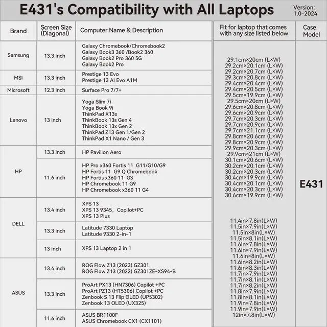 Model No.: E431; internal dimensions of the case: 32x 21.6 x2 cm ( 12.6 x 8.5 x 0.79 inch) ^^ Innovative Shock Protection- Super Corner Technology: Our patented Super Corner design provides outstanding impact protection, safeguarding your laptop from accidental bumps and drops. This cutting-edge design eliminates the need for excessive padding, ensuring top-tier protection in a sleek, perfectly sized sleeve ^^ Specially crafted for 13.3 inch MSI Prestige 13 Evo A13M-050US/A13M-074US/A12M-070US; 13.3 inch MSI Prestige 13 AI Evo A1M; this sleeve offers a precise, tailored fit that keeps your device secure. Say goodbye to ill-fitting, oversized sleeves, and enjoy a perfect fit that enhances your laptops safety ^^ Extensive Custom Sizes for