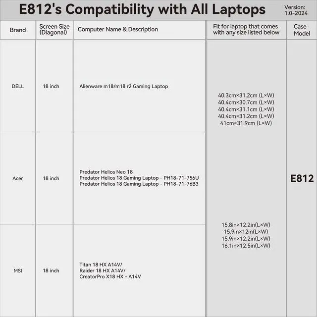 Model No.: E812; internal dimensions of the case: 43.5 x 33.2 x 2.5 cm ( 17.13 x 13.07 x 0.98 inch) ^^ Innovative Shock Protection- Super Corner Technology: Our patented Super Corner design provides outstanding impact protection, safeguarding your laptop from accidental bumps and drops. This cutting-edge design eliminates the need for excessive padding, ensuring top-tier protection in a sleek, perfectly sized sleeve ^^ Specially crafted for 18 inch Acer Predator Helios 18 AI; for 18 inch Acer Predator Helios 18 Gaming Laptop; for 18 inch Acer Predator Helios Neo 18 Gaming Laptop; this sleeve offers a precise, tailored fit that keeps your device secure. Say goodbye to ill-fitting, oversized sleeves, and enjoy a perfect fit that enhances your laptops safety ^^ Extensive Custom Sizes for