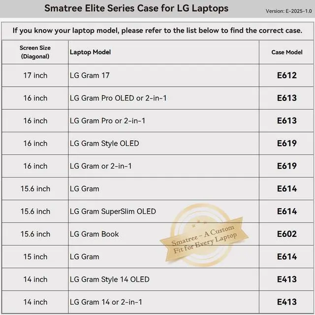 Model No.: E614; internal dimensions of the case: 38x24x2 cm ( 14.96 x 9.45 x 0.79 inch) ^^ Professional Shock Protection- Super Corner Technology: Engineered for superior impact protection, our patented Super Corner design safeguards your laptop against accidental drops and collisions without the need for bulky padding. This advanced design ensures that your sleeve remains sleek and perfectly sized, offering top-tier protection without the excess bulk ^^ Specifically designed for 15.6 inch LG gram; for 15.6 inch LG gram SuperSlim OLED; for 15 inch LG gram; this sleeve provides a snug, tailored fit that securely holds your laptop in place, reducing movement and enhancing protection ^^ Tailor-Made Solutions for LG and