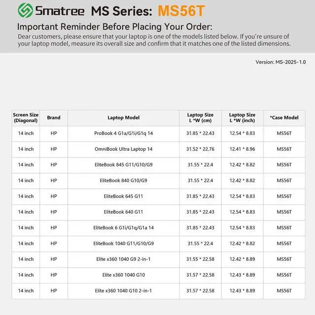 HP Laptops: smatree has more than 20 sizes of hard EVA protective sleeve case customized for HP laptops. If you're not sure which model of case is fit for your laptop, please feel free to contact our customer service