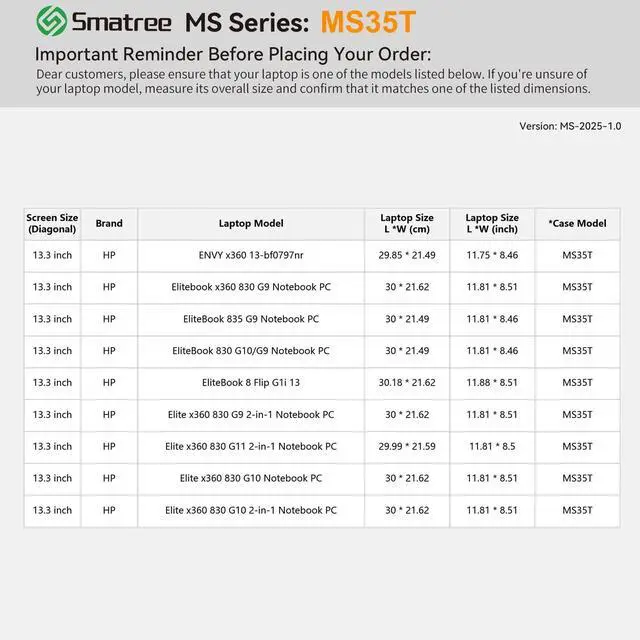 HP Laptops: Smatree has more than 20 sizes of hard EVA protective sleeve case customized for HP laptops. If you're not sure which model of case is fit for your laptop, please feel free to contact our customer service