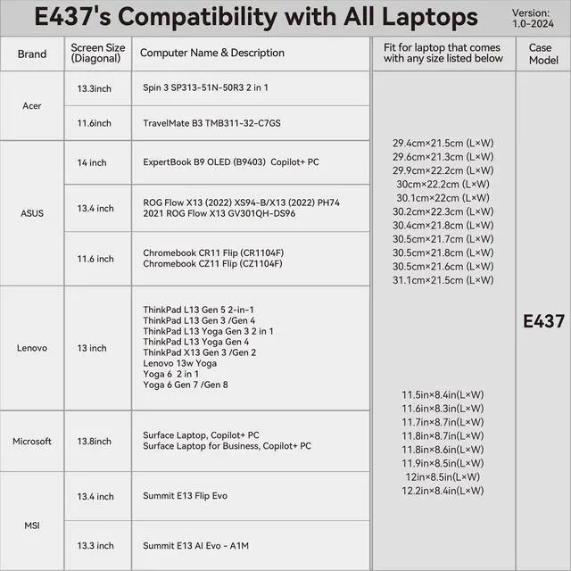 Model No.: E437; internal dimensions of the case: 32x 23.2 x2 cm ( 12.6 x 9.13 x 0.79 inch) ^^ Innovative Shock Protection- Super Corner Technology: Our patented Super Corner design provides outstanding impact protection, safeguarding your laptop from accidental bumps and drops. This cutting-edge design eliminates the need for excessive padding, ensuring top-tier protection in a sleek, perfectly sized sleeve ^^ Specially crafted for 13.3 inch Acer Spin 3 SP313-51N-50R3 2 in 1 Laptop; 11.6 inch Acer TravelMate B3 TMB311-32-C7GS Laptop; this sleeve offers a precise, tailored fit that keeps your device secure. Say goodbye to ill-fitting, oversized sleeves, and enjoy a perfect fit that enhances your laptops safety ^^ Extensive Custom Sizes for