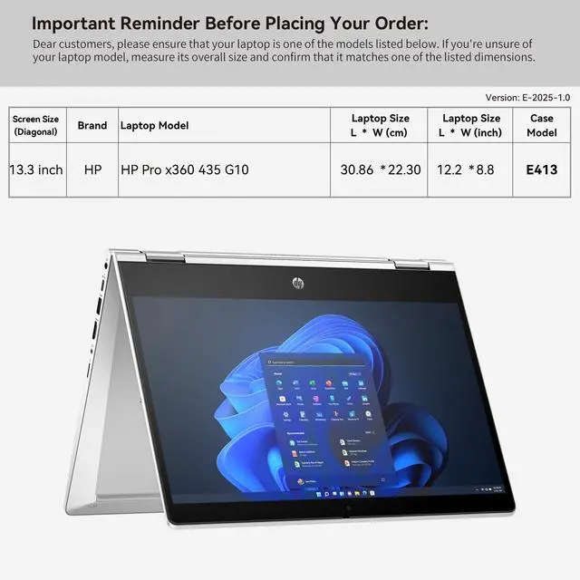 Super Corner Design: Our patented Super Corner impact protection technology is engineered to safeguard your laptop from accidental drops and bumps. This unique design delivers superior protection without adding unnecessary bulk, ensuring your device remains secure in a sleek, perfectly sized sleeve ^^ Specifically designed for 13.3 inch HP Pro x360 435 G10 Notebook PC-Customizable. Our sleeve provides a precise, secure fit that minimizes movement and maximizes protection ^^ Wide Range of
