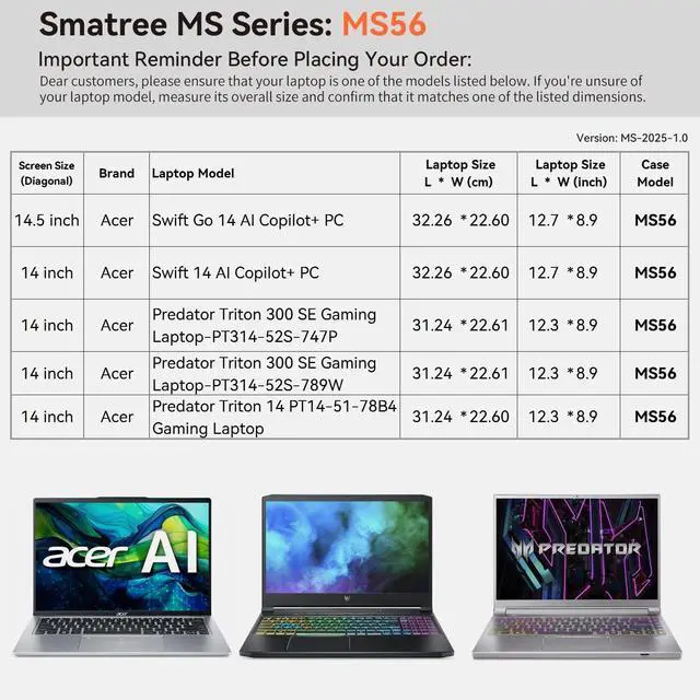 Acer Laptops: Smatree has more than 20 sizes of hard EVA protective sleeve case customized for Acer laptops. If you're not sure which model of case is fit for your laptop, please feel free to contact our customer service