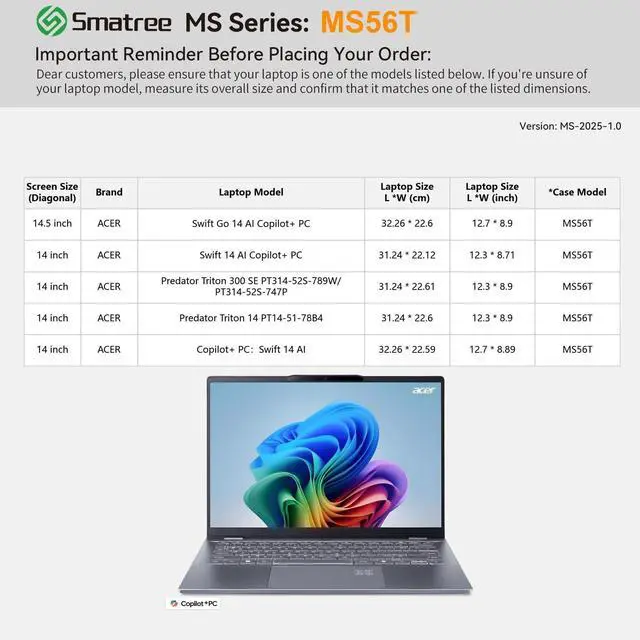 Compatibility: designed to perfectly fit for 14.5 inch Acer Swift Go 14 AI Copilot+ PC; 14 inch Acer Swift 14 AI Copilot+ PC; 14 inch Acer Predator Triton 300 SE Gaming Laptop-PT314-52S-747P; 14 inch Acer Predator Triton 300 SE Gaming Laptop-PT314-52S-789W; 14 inch Acer Predator Triton 14 PT14-51-78B4 Gaming Laptop ^^