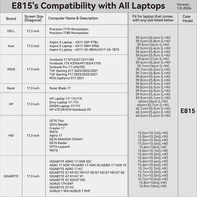 Model No.: E815; internal dimensions of the case: 42.5 x 27.5 x 2.5 cm ( 16.73 x 10.83 x 0.98 inch) ^^ Professional Shock Protection- Super Corner Technology: Engineered for superior impact protection, our patented Super Corner design safeguards your laptop against accidental drops and collisions without the need for bulky padding. This advanced design ensures that your sleeve remains sleek and perfectly sized, offering top-tier protection without the excess bulk ^^ Specifically designed for 17.3 inch GIGABYTE AERO 17 HDR XD/YD/XC/YC; for 17.3 inch GIGABYTE AERO 17 KC; this sleeve provides a snug, tailored fit that securely holds your laptop in place, reducing movement and enhancing protection ^^ Tailor-Made Solutions for GIGABYTE and