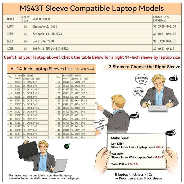 Splash-Resistant: the smatree sleeve is made of durable 280g nylon lycra, it obstructs water effectively. Don't worry about splashing water, washable when laptop sleeve case becomes dirty ^^ Smatree Pioneering Custom-Sized Protection for Every Laptop. Over 100 precision-fit sizes engineered for 2, 000+ laptop models. If you're not sure which model of sleeve is fit for your laptop, please check the Product Description. We provide a sleeve model list for most 14-inch laptops; check it to find your ideal fitting sleeve.