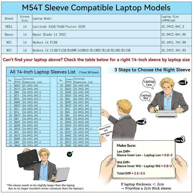 Splash-Resistant: the smatree sleeve is made of durable 280g nylon lycra, it obstructs water effectively. Don't worry about splashing water, washable when laptop sleeve case becomes dirty ^^ Smatree Pioneering Custom-Sized Protection for Every Laptop. Over 100 precision-fit sizes engineered for 2, 000+ laptop models. If you're not sure which model of sleeve is fit for your laptop, please check the Product Description. We provide a sleeve model list for most 14-inch laptops; check it to find your ideal fitting sleeve.