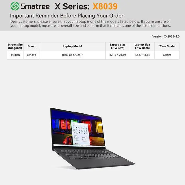 Model No.: X8039; internal dimensions of the case: 32.5 x 21.3 x 2.7 cm ( 12.8 x 8.3 x 1.1 inch). Only fit for 14 inch Lenovo IdeaPad 5 Gen 7 laptop. This Laptops dimension is 32.1 x 21.1 x 2.2 cm. Please confirm your laptop model or dimension ^^