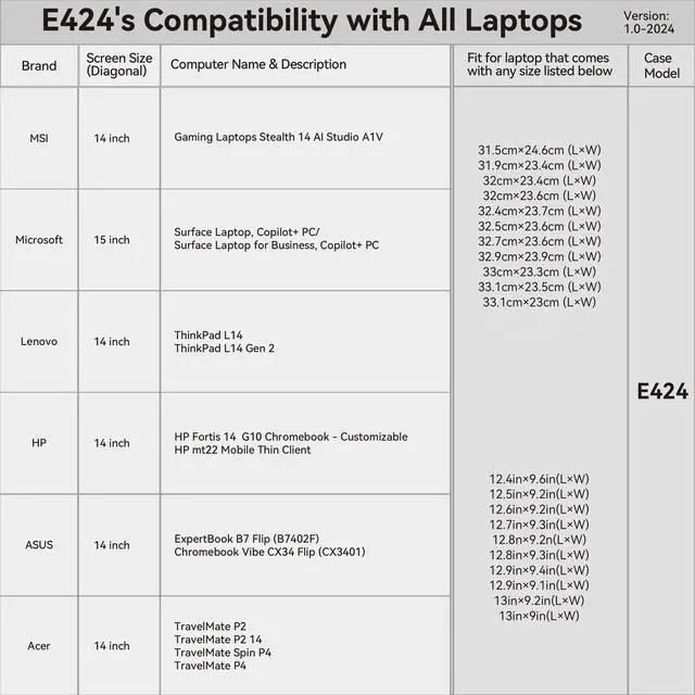 Model No.: E424; internal dimensions of the case: 34.5 x25x2 cm ( 13.58 x 9.84 x 0.79 inch) ^^ Innovative Shock Protection- Super Corner Technology: Our patented Super Corner design provides outstanding impact protection, safeguarding your laptop from accidental bumps and drops. This cutting-edge design eliminates the need for excessive padding, ensuring top-tier protection in a sleek, perfectly sized sleeve ^^ Specially crafted for 14 inch Acer TravelMate P2 TMP214 Laptop; 14 inch Acer TravelMate Spin P4 TMP414RN 2 in 1 Laptop; 14 inch Acer TravelMate P4 TMP414 Laptop; this sleeve offers a precise, tailored fit that keeps your device secure. Say goodbye to ill-fitting, oversized sleeves, and enjoy a perfect fit that enhances your laptops safety ^^ Extensive Custom Sizes for