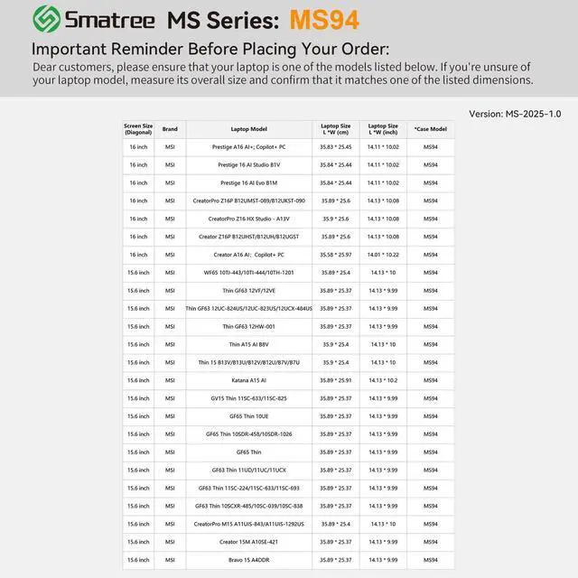 MSI Laptops: Smatree has more than 20 sizes of hard EVA protective sleeve case customized for MSI laptops. If you're not sure which model of case is fit for your laptop, please feel free to contact our customer service