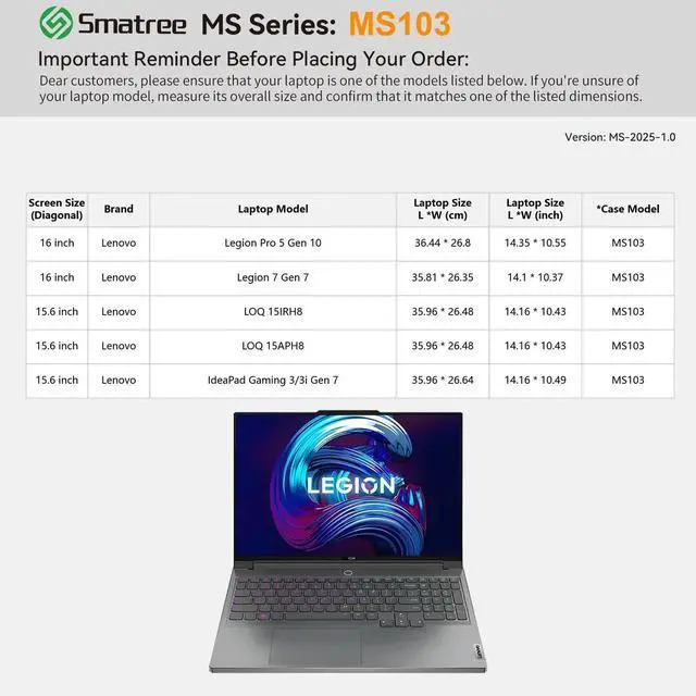 Compatibility: designed to fit for 16 inch Lenovo Legion 7 Gen 7; 15.6 inch Lenovo IdeaPad Gaming 3 Laptop/3i Gen 7; 15.6 inch Lenovo LOQ 15APH8/15IRH8 Gaming Laptop; 16 inch Lenovo Legion 7i Gen 10 ^^