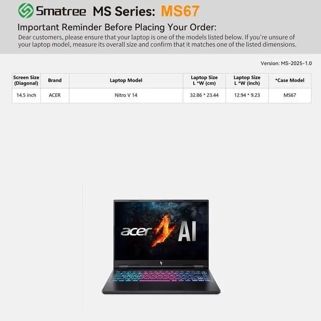 Acer Laptops: smatree has more than 20 sizes of hard EVA protective sleeve case customized for Acer laptops. If you're not sure which model of case is fit for your laptop, please feel free to contact our customer service