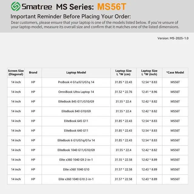 HP Laptops: smatree has more than 20 sizes of hard EVA protective sleeve case customized for HP laptops. If you're not sure which model of case is fit for your laptop, please feel free to contact our customer service