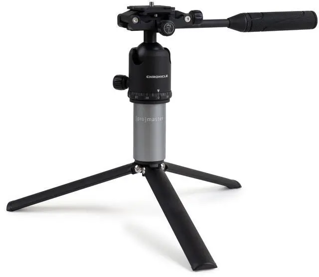 Unique ball head switches from camera to phone mode in seconds ^^ Dual-action ball head with tension adjustment and two Us ^^ Dovetail (arca-compatible) quick release plate included ^^ Utilizing the built-in Flexor, the Chronicle can be used as a standard tripod, handheld stabilizer, tabletop/ground-level tripod, traditional monopod, and monopod with 3-leg base. ^^ Removable smooth control handle ^^ 1/4-20 and 3/8-16 threaded accessory ports ^^ Bubble levels on tripod and ball head ^^ Independently adjustable leg angles ^^ Soft, comfortable grips on touch points ^^