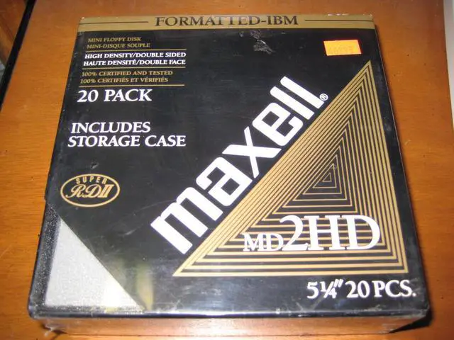 New box of Maxell 5.25 inch diskettes, shrinkwrapped and in a convenient case. Double sided, double density, formatted at 96 tracks per inch.