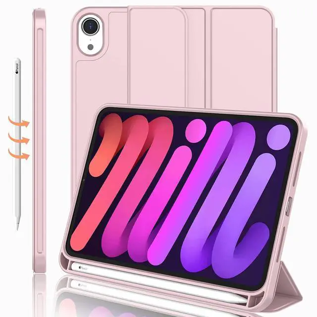 iMieet iPad Mini 7 Case 2024 (A17 Pro), iPad Mini 6 Case (8.3-Inch,2021 Model), iPad Mini 7th/6th Generation Case with Pencil Holder, Trifold Stand Smart Case with Soft TPU Back,Pink