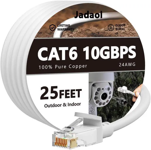 Cat 6 Outdoor Ethernet Cable 25 ft, Support Cat8/7 Network, 10Gbps 550MHz, 24AWG Pure Copper, Direct Burial Waterproof In-Ground UV Resistant LAN Internet Patch Cable for Router, Modem, Switch, White