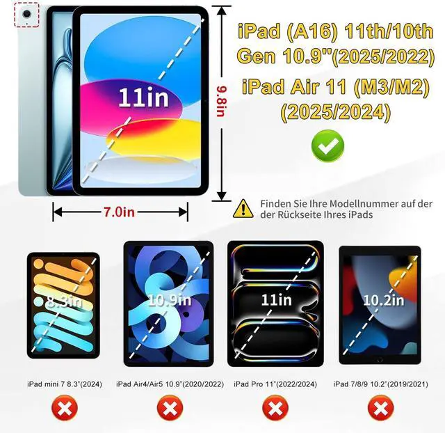 Compatible:11th/10th Generation 10.9 inch (Model: A3355,A3356,A2696, A2757, A2777) 2025/2022 Released, iPad Air 7th/Air 6 11":(A2902, A2903)