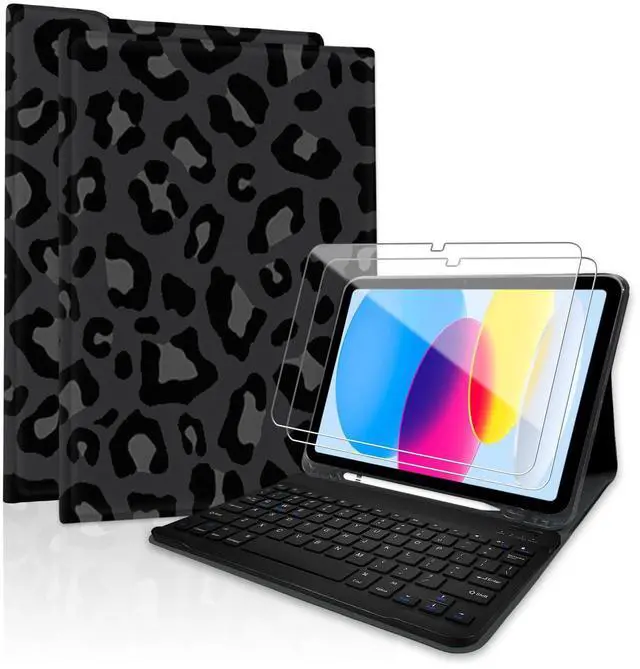 TopPerfekt for iPad Air 11-inch(M2 2024/M3 2025)Bluetooth Keyboard Case with 2 Pack 9H Hardness Tempered Glass, Rechargeable, Magnetically Absorbent, for iPad Air4/5th 2020/2022 10.9" -Leopard Blackgrey
