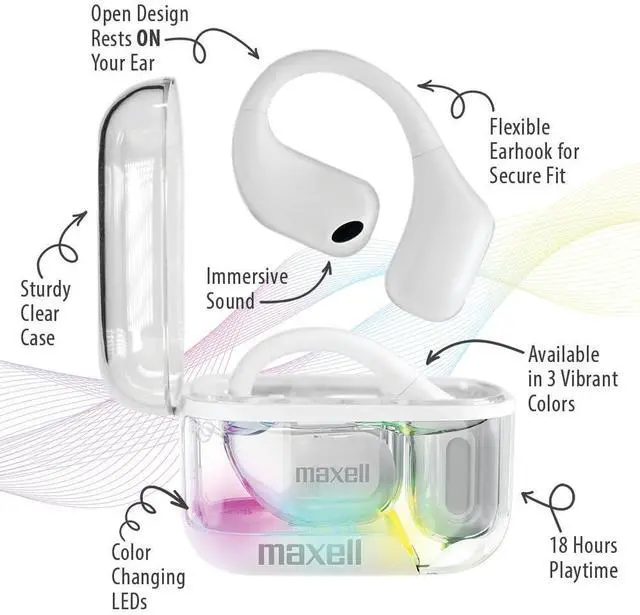 Immersive Sound: The Maxell OWS Pro Earhooks create an audio experience thats more like a private concert with crisp and powerful highs to clear and soft lows. 18 Hours Playtime with
