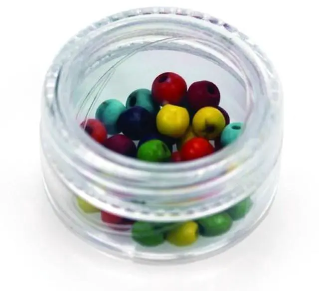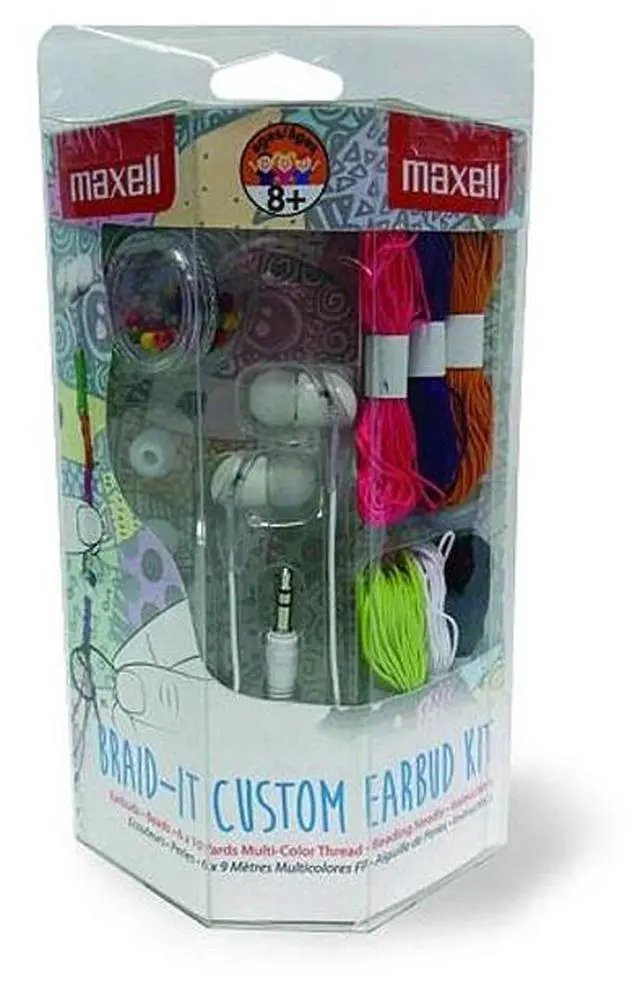 Kit includes: earbuds, 6 different thread colors, and multi-colored beads
