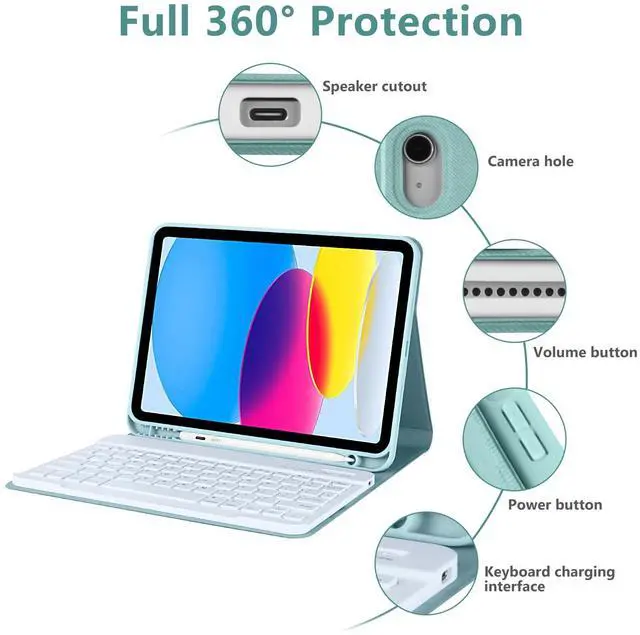 [(Pen Holder Slot)] For iPad 10th generation case with keyboard built-in pencil holder and pen slot on top for easy use and placement; The inner layer of the case has a honeycomb grid pattern pad that releases 80% more heat than other cases to prevent overheating and extend the life of iPad by over 30% for maximum protection; There is a soft TPU inner case to protect your device f