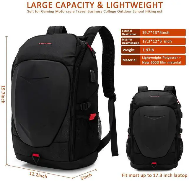 Desimension: 17*12*5 inch, Weight: 1.97 lb. Fit most up to 17 inch laptop. Made of the high quality polyester fabric and 600D film material, super lightweight, durable, water spill resistant, anti-tearing & scratch. ^^ Waterproof & USB PortThe motorcycle gaming backpack comes with a fully lightweight professional rain cover at bottom of the backpack pocket, convenient to carry and keep your valuable item safe from the rain. The built-in USB charging port offers you a convenience to charge your electronic device anywhere.