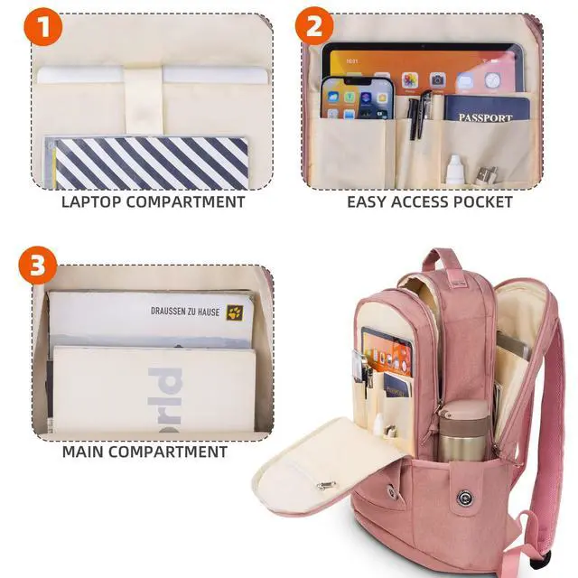 It also comes with sturdy handle & adopt the double & enhanced sewing technology, especially for every force position, make the backpack bear weight up to 22lb. ^^ Multi-Compartments & Bottle holderThe large capacity women men backpack with separated laptop computer compartment, 2 big zipper compartment, 1 stylish convenient deep pocket. Except the laptop, you can also put all your work business necessaries, such as daily cosmetic or important papers & samples etc, as well as 3-5 days clothes for travel work college daypack. The laptop backpack is with bottle holder, make your journey more convenient.