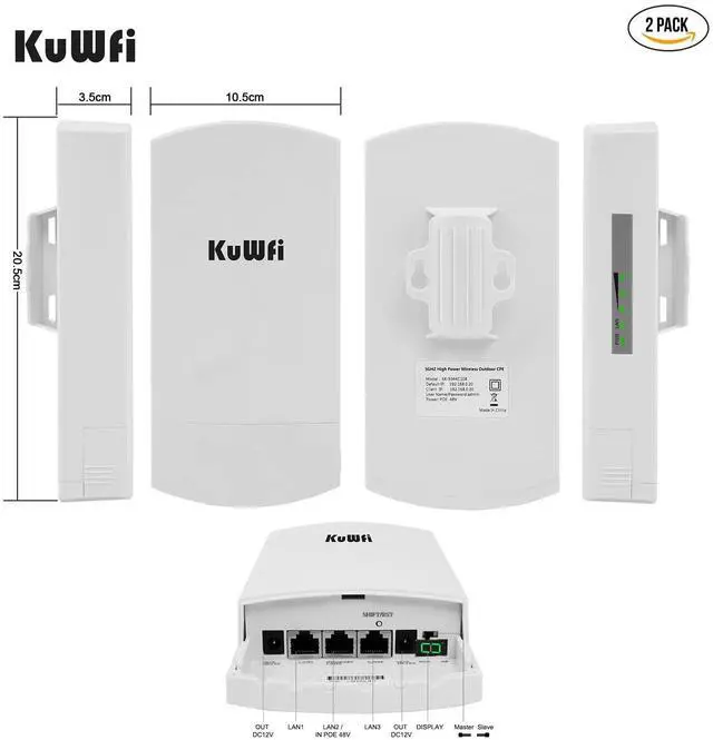 KuWFi CPE400: An outdoor point to point wireless bridge, Extend your house network to the second building, such as garages, barns, shops, and even neighbors, without having to layout network cables, saving costs. Also suitable for surveillance cameras ^^ Outdoor IP65