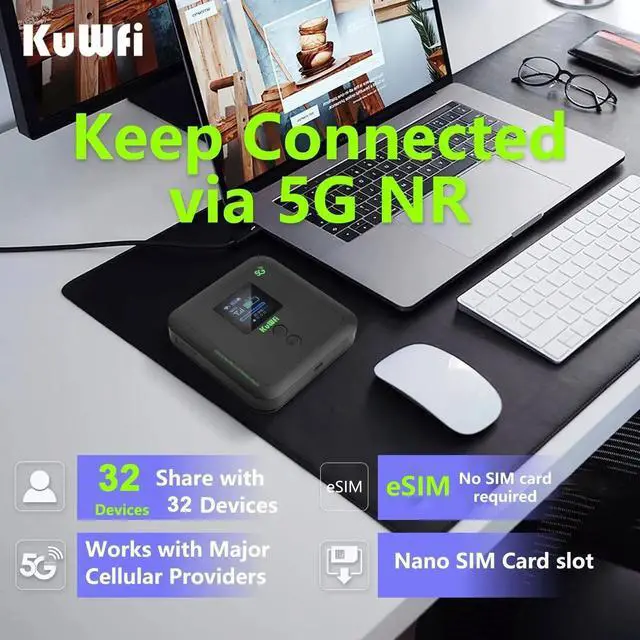 WiFi 6 Speed: Experience 3000Mbps (or 3.6 Gbps) lightning-quick downloads and seamless connectivity. This 5G Mobile Hotspot Router converts 5G cellular signal into ultra-fast WiFi 6 (Dual-Band 2.4GH z/5GHz), virtually eliminating lag and buffering for 4K/8K streaming, gaming, and video conferencing. ^^ 6000mAh Powerhouse & Massive Capacity Equipped with a 6000mAh long-lasting battery for extended power, making it the perfect companion for RV trips, camping, and outdoor work. Easily share your high-speed connection with up to 32 devices simultaneously, providing secure, private WiFi for your entire family or team. ^^ Ultra-Flexible Unlocked Compatibility This is an Unlocked 5G Cellular Router, offering maximum freedom. It features eSIM and SIM Card Dual Support, ensuring connectivity almost anywhere in the world. Fully compatible with major US carriers including AT&T and T-Mobile SIM cards. * (SIM card not included). ^^ 32 device shares5G Mobile Hotspot Router Supports 30 00Mbps high-speed download intelligent distribution improves network speed. Wi-Fi 6 supports faster wifi than prior standards and permits 32 connected devices. ^^ Plug & Play Private Secure WiFi Get connected instantlysimply insert a compatible SIM card to use.