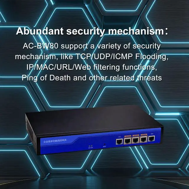 ^^ Multiple Gigabit WAN and multiple routing functionsAC-BW80 support PPPoE/DHCP/Static IP/PPTP access, work with different ISP and max 80 end users can access into it. Support multiple Gigabit WAN ports, support load balance, Ethernet Superimposed and multiple ISP network access to avoid bandwidth overload, then support Ethernet backup to recover the dropped networking line, ensure the whole networking smoothly; It support policy-based routing function also, administrator will set the network ba ^^ powerful QoS functionsOne-click to enable/disable the smart QoS, which can recognize the traffic size and traffic characteristics, algorithm the fairness and control network latency to improve the downloading, video, games and web pages network experience.