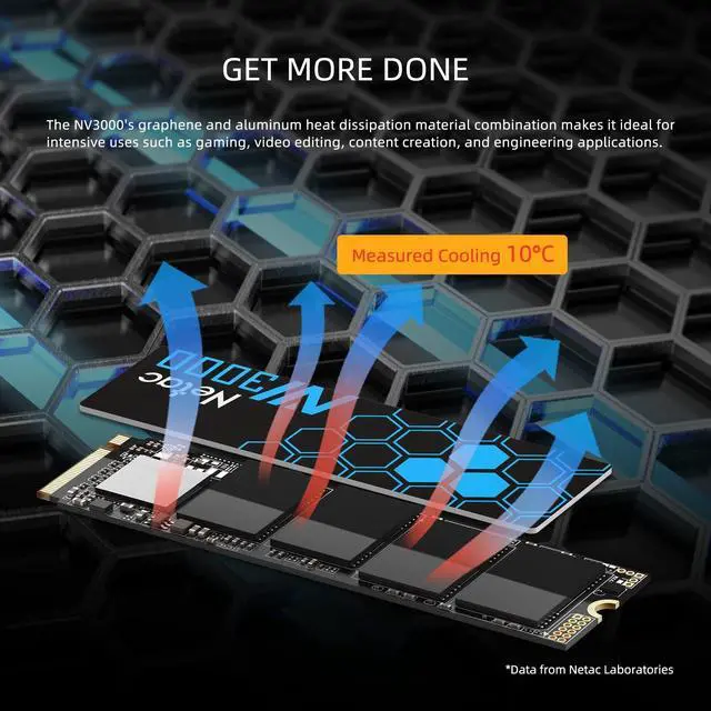 Performance enhancement for Netac NV3000 SSD, with read/write rates of up to 3, 000/1, 400 MB/s. ^^ With a maximum capacity of 2TB and a thinness of only 0.65 mm, the M. 2 NVMe PCIe Gen3 x 4 interface allows for real-time cooling of operating temperatures by 10C. ^^ The addition of a graphene metal heat sink, ideal operating temperatures are maintained to reduce performance reductions. ^^ Low power requirements, low noise, and durability to shock and impact. Anti-vibration design to help prevent data loss when accidentally.