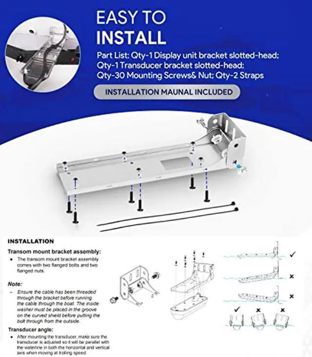 Package Include: Set of 1 Transom Transducer Mount Bracket (Includes Mounting Parts); Qty-1 User Installation Manual