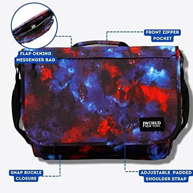 DescriptionAbout J World New York Bold patterns and sophisticated designs are J World New York's Unique features. Inspired by the New York City Lifestyle, each collection accommodates different needs and looks for active and fashion conscious people. Our brand also collaborates with artists from all over the world to further polish and perfect our designs so that we can offer unique and innovative products to our customers. From backpacks and messenger bags to luggage, duffel bags and tote bags, our brand encourages your style personality. 'REVEAL YOUR COLOR WITH J WORLD NEW YORK' Features PEFECT SIZE FOR SCHOOL: Dimension of 17 x 13.5 x 6 inches Messenger Bag with
