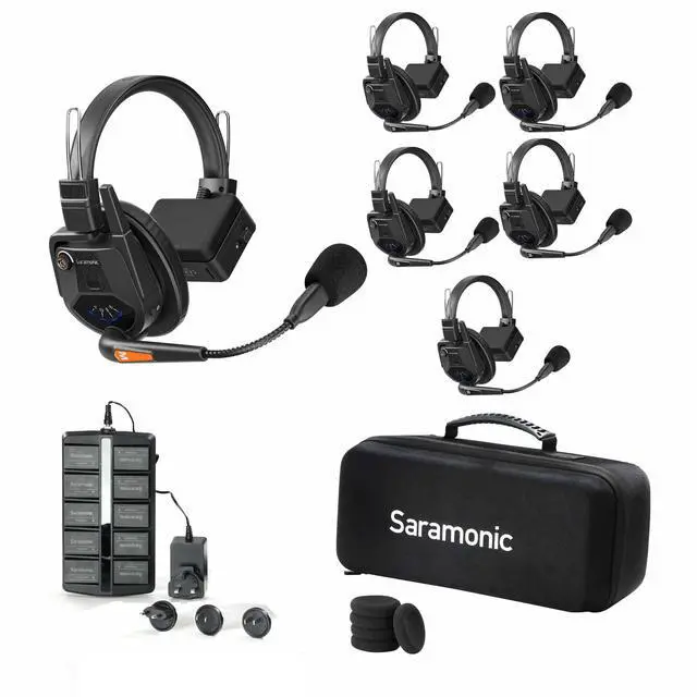 5-Person 1.9GH z DECT Wireless Intercom System with True Full-Duplex Hands-Free Operation for Professional Team Communication ^^ Lightweight and Comfortable Headsets with IPX5 Water Resistance, Level 3 Wind Protection, Gooseneck Mic Lever or Button Muting, Volume Control, and Cooling Gel Over-Ear or Foam On-Ear Earpads ^^ Dual-Antenna design for an Industry Leading 1640-feet (500m) line-of-sight Range. AGC Noise Cancellation and Encryption ensures Secure, Stable, and Clear Communication ^^ Scalable Hub-Less Expandability to up to 30-People with Wired Cascading, BT or Wired connection to Computers and Mobile Devices for Remote Team Communication through Meeting Apps and Phone Calls ^^ Up to 15-Hours Remote / 9-hours Master Headset Runtime on Single Charge with 10x Quick-Release Batteries Included, 10-Bay Charger, and USB-C Powering