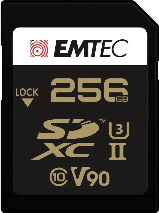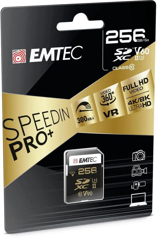 Product Features: EMTEC SD 256GB UHS-II U3 V90 SpeedIN Pro+ High Performance Memory Card, Read Speed up to 300MB/s, Write Speed up to 270MB/s, Compatibility: 64, 128, 256GB. Compatible with devices that support SDXC standards. Backwards compatible with UHS-I. Capacity of 64, 128 and 256 GB.