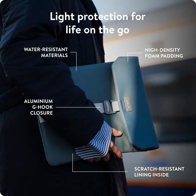 L: 17mm ^^ THE RIGHT AMOUNT OF WATER RESISTANCE - Made from durable, water-resistant 420D recycled nylon and 600D coated nylon with a secure G-hook closure, this sleeve protects your laptop from light water exposure like rain ^^ PROTECTING TECH FROM BUMPS AND SCRATCHES - The high-density padded foam lining cushions your laptop against bumps and knocks while the soft internal lining prevents scratches and scuffs ^^ REAR SLIP POCKET - We've added a rear slip pocket so you can store extras like a tablet, cables or slim notepad. A discreet magnet at the top of the pocket adds a little extra security, ensuring your belongings stay in place ^^ LIGHTWEIGHT, VERSATILE DESIGN - With its minimalist design, subtle technical details and four fresh colors, the Universal Laptop Sleeve seamlessly complements other Mous products like cases and backpacks, letting you build your own Mous ecosystem