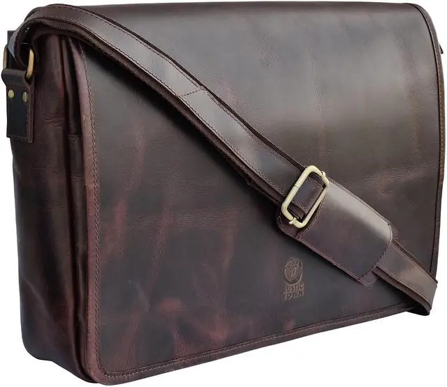 RUSTIC TOWN Leather Messenger Bag for Men Women - Full Grain Leather Laptop Satchel Office Shoulder Bag (16-Inch, Dark Brown)