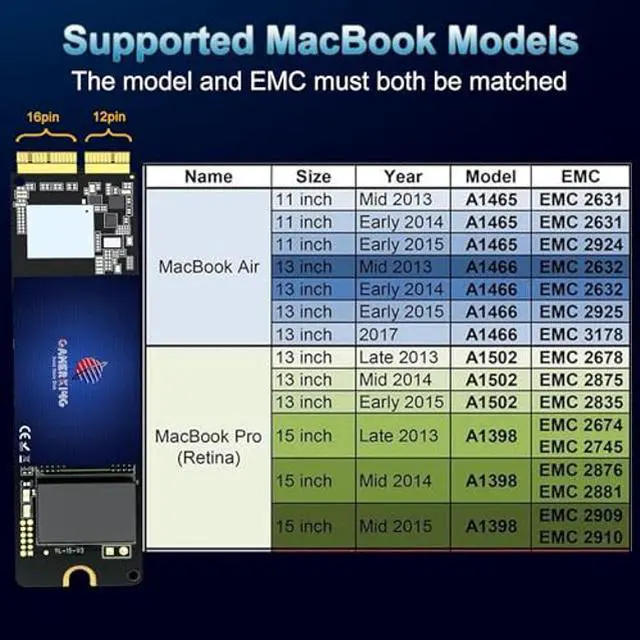 • [(Compatibility)] This MacBook Air replacement ssd fits for MacBook Air Mid 2013/Early 2014 A1465 emc 2631, Early 2015 A1465 emc 2924; Mid 2013/Early 2014 A1466 emc 2632, Early 2015 A1466 emc 2925, 2017 A1466 emc 3178; fits for MacBook Pro Late 2013 A1502 emc 2678, Mid 2014 A1502 emc 2875, Early 2015 A1502 emc 2835; Late 2013 A1398 emc 2674, 2745; Mid 2014 A1398 emc 2876, 2881; Mid 2015 A1398 emc 2909,2910.