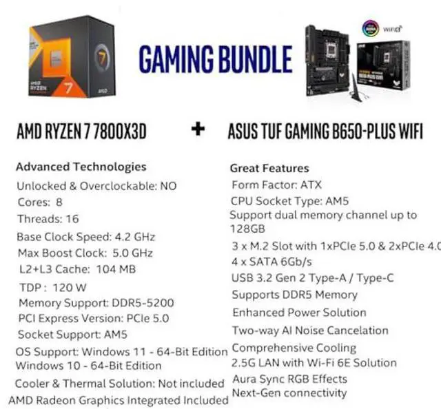 Micro Center AMD Ryzen 7 7800X3D 8-Core16-Thread Desktop Processor Bundle with ASUS TUF Gaming B650-PLUS WiFi Socket AM5 PCIe 5.0 DDR5 Ryzen 7000 ATX Gaming Motherboard