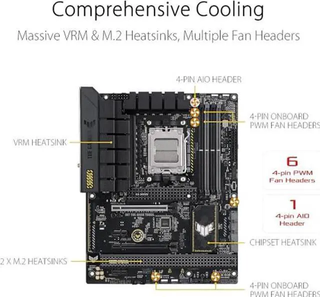 ASUS TUF Gaming B650-PLUS WiFi Motherboard, ATX Form Factor, AM5 Socket. Support DDR5 Dual Channel up to 128GB, 3 x M.2 PCIe with 1 x PCIe 5.0 x4 and 2 x PCIe 4.0 x4 slots, 4 x SATA 6Gb/s ports, USB 3.2 Gen 2x2, Wi-Fi 6E, 2.5G LAN. Supports AMD Ryzen 7000 Series Desktop Processors